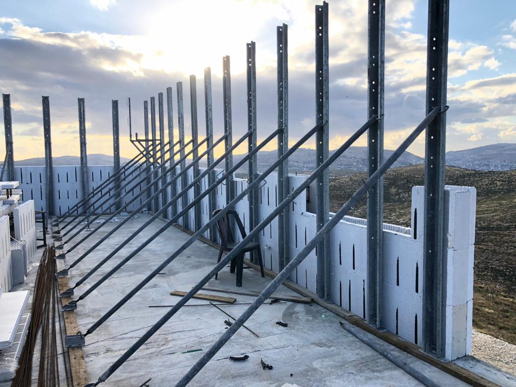 ⦁ את התמיכות ממקמים בפינות, משני צידי חלונות ופתחים, במקביל לתשתית צמ"ג, ביוב וניקוזים העוברים בחתך הקיר ולאחר מכן משלימים כך שיתן כיסוי כל 80 ס"מ באורך הקיר.